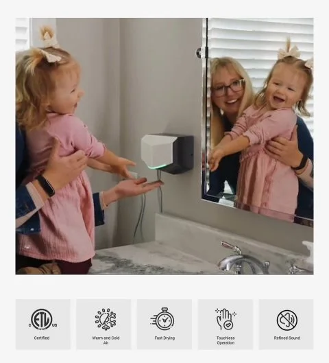 The RevSquared Hand Dryer is designed for easy use and has straightforward setup (yes please). It is a corded appliance so you don’t need to call an electrician or your neighbor or play with wires on your own! Featuring a compact design and an accessory stand (no mounting needed!!!) this hand device becomes a reliable solution for situations where traditional paper towels are unavailable or hand towels are dirty. Or you have kids who are allergic to drying their hands.