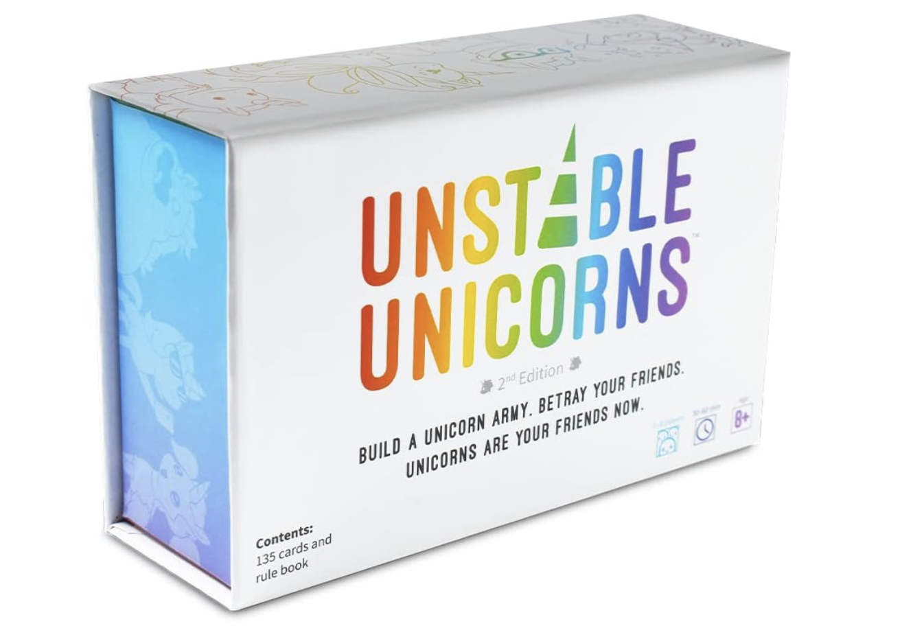 Welcome to Unstable Unicorns, the strategic card game where friendship meets betrayal in a battle to build your unicorn army! Gather 2-8 players, ages 8+, for 30-60 minutes of fast-paced fun. Be the first to collect 7 unicorns in your stable while using cunning and chaos to sabotage your friends. With 135 cards and expansions like Dragons and Nightmares, the magic never ends! Winner of the 2019 People's Choice Award for Toy of the Year, Unicorns are your friends now... until they're not! Get it here.